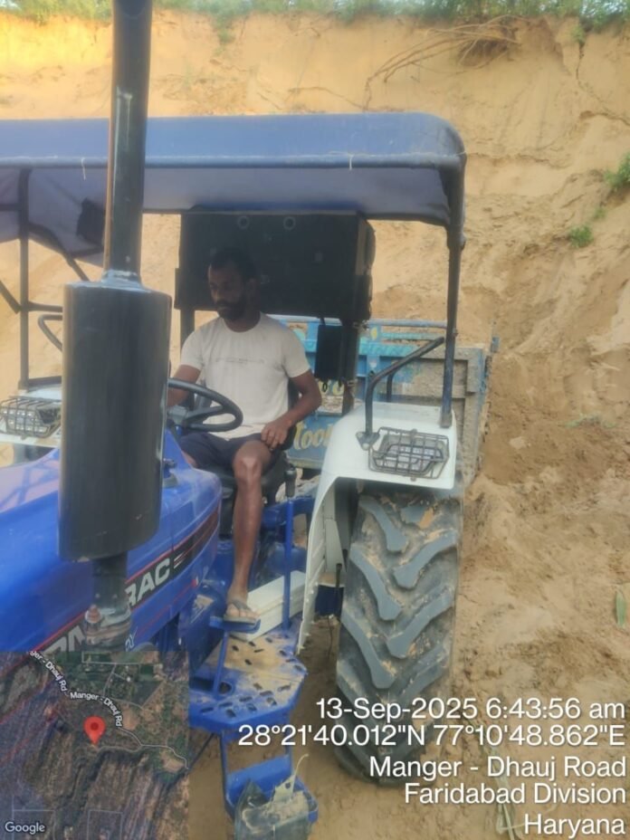 फरीदाबाद। उपायुक्त विक्रम सिंह के दिशा-निर्देशन में वन विभाग की टीम ने अरावली वन क्षेत्र में हो रहे अवैध खनन पर कड़ा शिकंजा कसते हुए धौज क्षेत्र में बड़ी कार्रवाई की है। शनिवार सुबह तड़के टीम ने मिट्टी चोरी करते हुए एक ट्रैक्टर-ट्रॉली को रंगे हाथ पकड़ लिया।